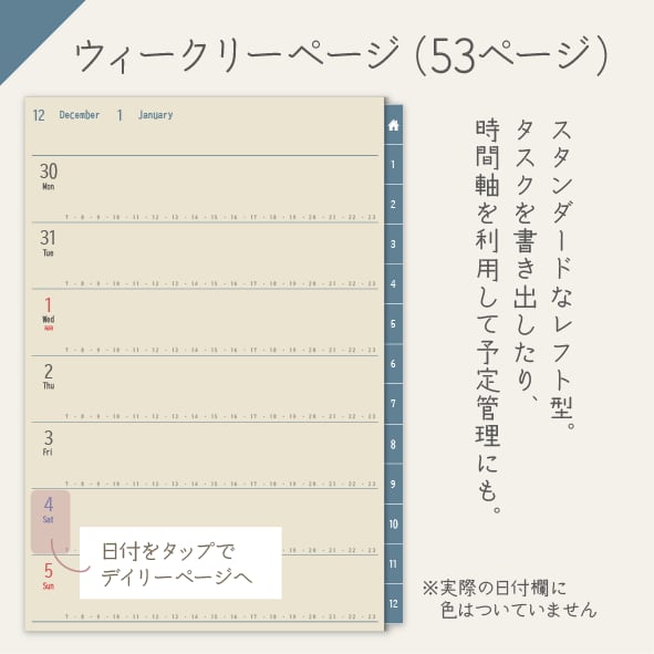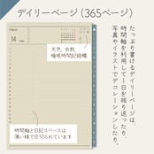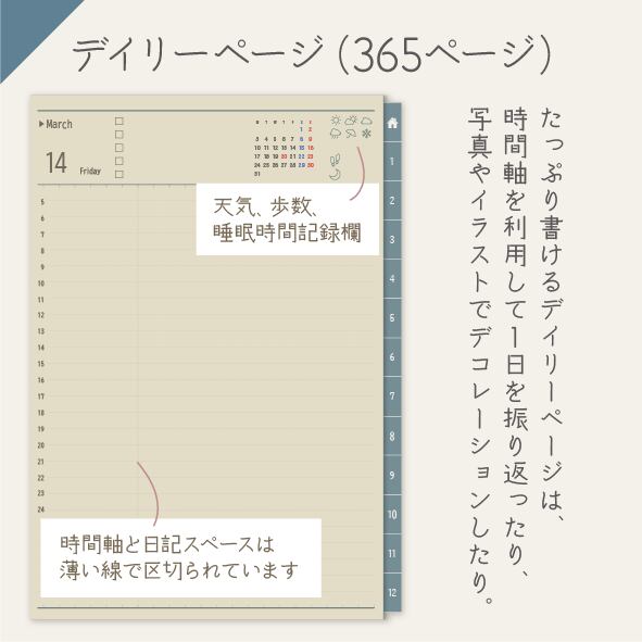 1日1ページで自由度抜群!タイムテーブルで1日を振り返ったり、日記を書いたり、コラージュも楽しめます